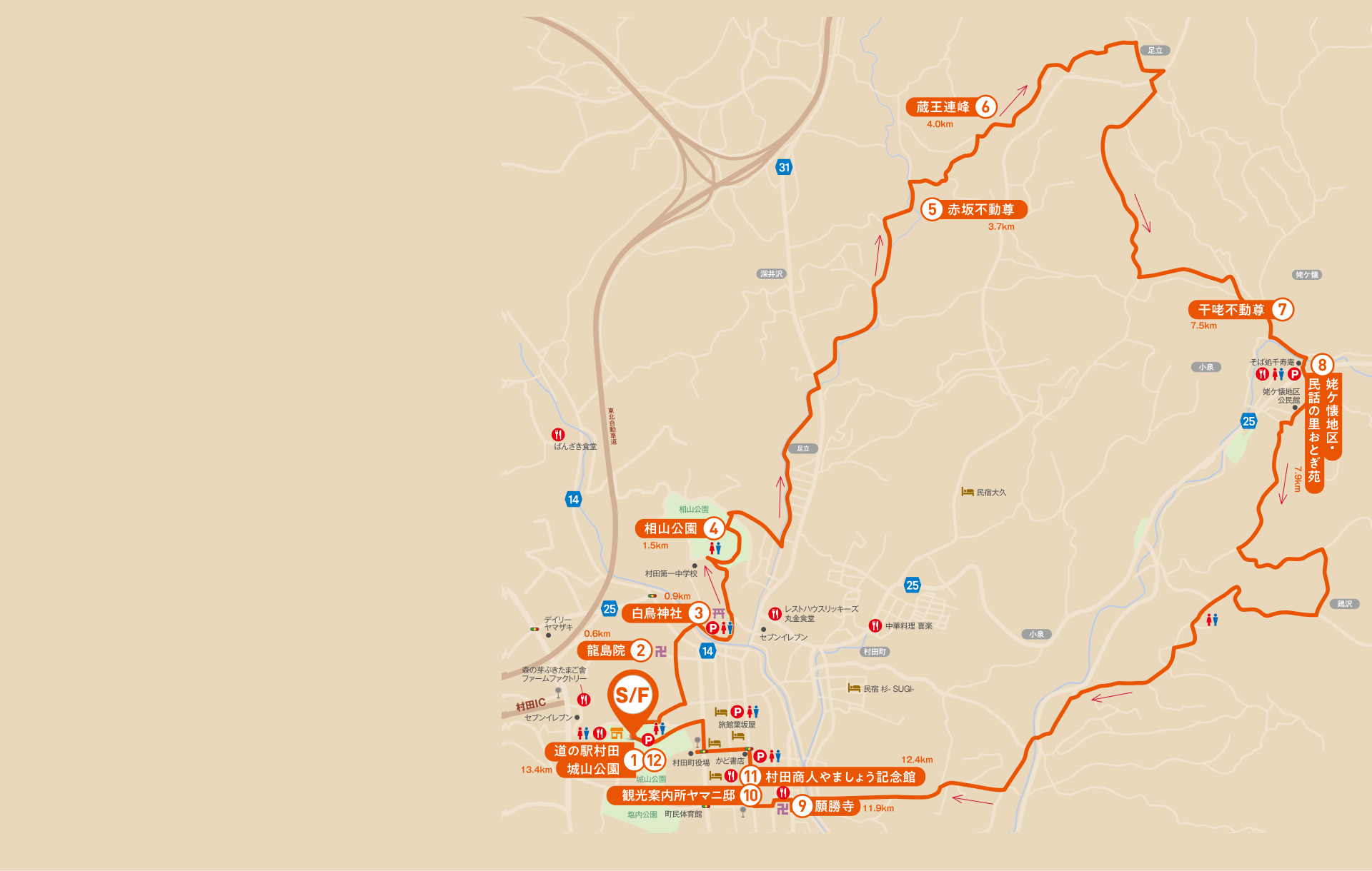 江戸時代から昭和初期にかけて紅花取引が盛んだった村田。時は流れても古き時代の面影は、現在へと静かに伝えられ、豪勢な店蔵と重厚な門が連なる景観は人の目と心を魅了しています。かつての賑わいを映し出すこの蔵の町並みは保存状態も良く大変貴重であることから、平成26年9月に宮城県で初めての国の「重要伝統的建造物群保存地区」に選定されました。村田コースは道の駅村田を発着とし、序盤は伊達家が紡ぐ歴史や村田に伝わる伝説に触れることができます。木々の緑や沢のせせらぎを感じながら歩を進めると、小高い丘では雄大な蔵王連峰を大パノラマで眺望できます。中盤の姥ヶ懐地区には蕎麦処が点在しており、自然豊かな景色の中で格別な蕎麦を食べ比べすることができます。町中心部へ戻ってくると「みちのく宮城の小京都」と呼ばれる蔵の町並みがお出迎え。町有数の豪商「やましょう」の邸宅は、国の重要文化財に選定され「村田商人やましょう記念館」として蔵や屋敷を見学できます。また、蔵の観光案内所「村田町ヤマニ邸」では観光の案内だけでなく土産品の販売なども行っています。スタート地点の道の駅村田に戻ってきた後は、特産品のそら豆を使用したアイスクリームやうどんなどのそら豆加工品、朝採りの新鮮野菜など地場産品を取りそろえた物産コーナーでのお買い物や、レストランにて疲れた体をリフレッシュすることが出来るのも村田コースの魅力です。
