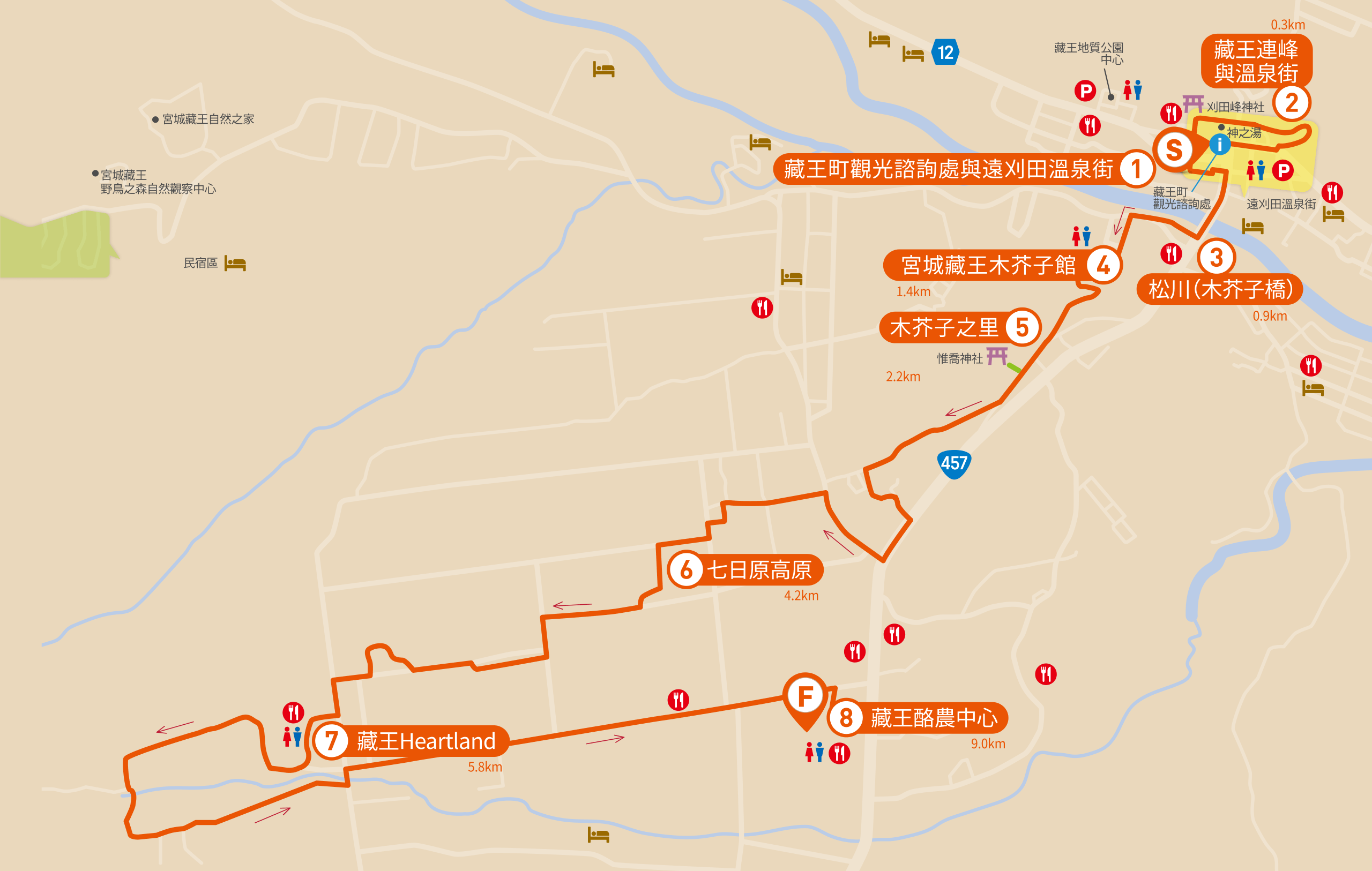 藏王町位於東北靈峰--藏王連峰的東部山麓、宮城縣西南部,整個小鎮皆屬於「藏王地質公園」範圍,於2025年1月正式獲認定為日本地質公園。藏王・遠刈田溫泉路線由「藏王町觀光諮詢處」出發。諮詢處位於遠刈田溫泉街的中心地帶,自江戶時期以來便是繁華熱鬧的溫泉小鎮。行程從洋溢人情味的「藏王通商店街」起步,一路前往可遠眺藏王連峰與溫泉街風光的觀景點。象徵遠刈田溫泉的地標「木芥子橋」橫跨松川,橋畔的自行車道整修完善,沿河延伸。春季時節,河岸櫻花與遠方藏王連峰的殘雪相映成趣,構成絕美景致。緊接著造訪「宮城藏王木芥子館」,這裡完整收藏並展示東北各地發展出的傳統木芥子作品。展館西側為「憩之森」,這片寧靜森林由宮城縣大河原產業高等學校的學生在實習課程中親手整備維護。穿過森林,便抵達充滿歷史情感的「木芥子之里」,這個木地師聚落是東北最古老的小芥子產地之一。座落於此的「惟喬神社」供奉著木地師的始祖,靜謐的氛圍令人心生敬意。路線繼續延伸,順著充滿自然與生活氣息的農田小徑前行,逐漸上升至標高約550公尺的「藏王Heartland」牧場,廣闊的草原展現於眼前,360度全景盡收藏王連峰與遠刈田溫泉街的壯闊景致。路線的終點站是「藏王酪農中心 Cheese Cabin」。這座與起司製作工場相鄰的直營店,不僅能讓您品嘗風靡日本全國的藏王起司,園區內還設有販售當地特產品的專區,以及主要在初夏時節盛開的玫瑰花園,是遠刈田地區的人氣觀光景點。這是一條能沉浸於遠刈田溫泉的裊裊湯煙,感受充滿底蘊的歷史情懷,並親身體驗人與自然共生之美的療癒之路。